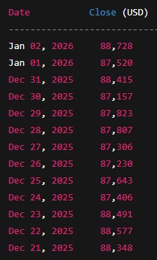 Rolling snapshot of key every day closes (Dec 19, 2025 – Jan 2, 2026):
