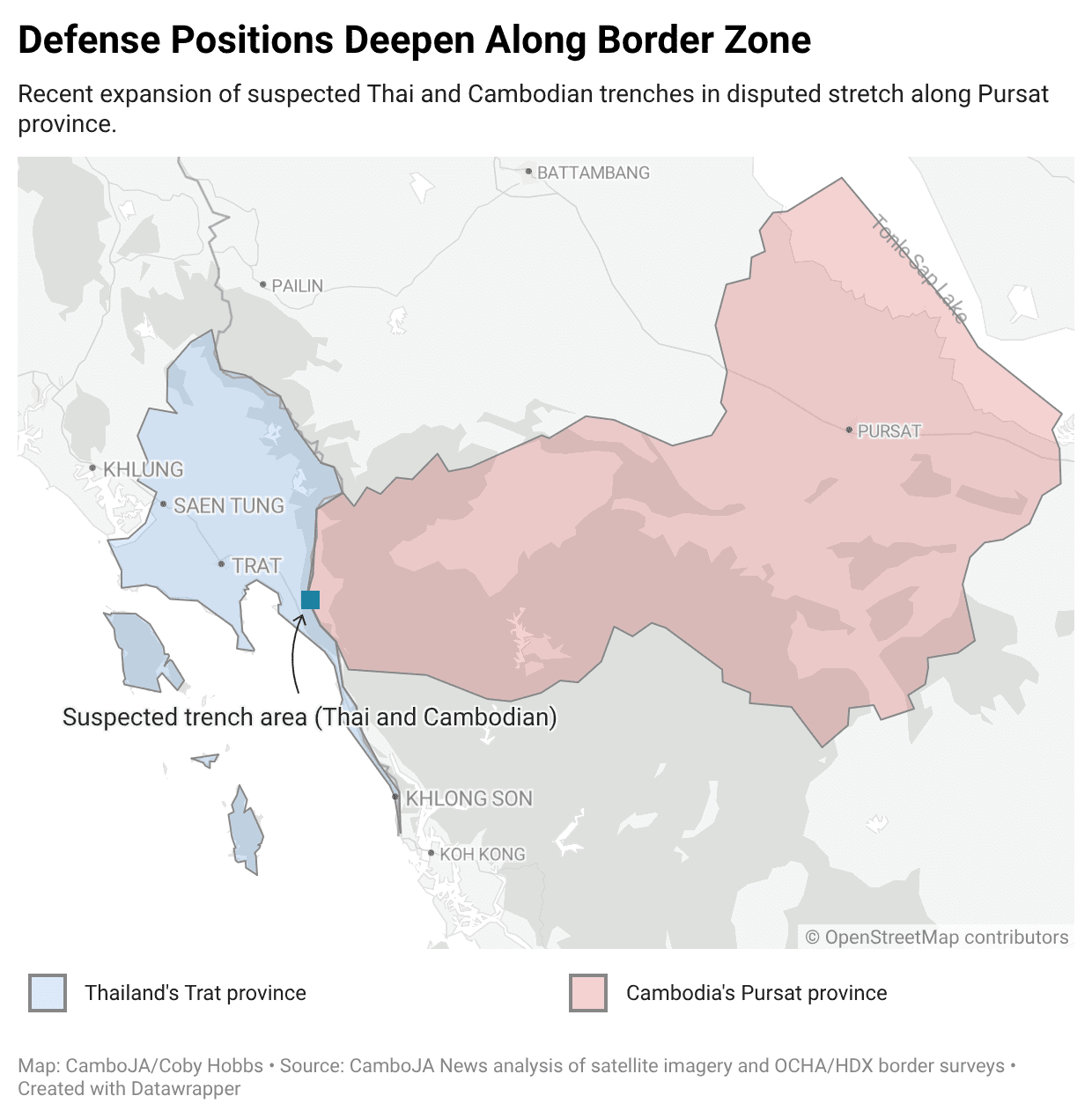 Thai and Cambodian forces seem to have dug in alongside a disputed stretch of Thmor Da commune in Pursat province, which Thailand says shouldn’t be but demarcated, carving out a number of kilometers of trenches regardless of a ceasefire reached final month, a CamboJA Information evaluation of satellite tv for pc imagery and border surveys suggests.