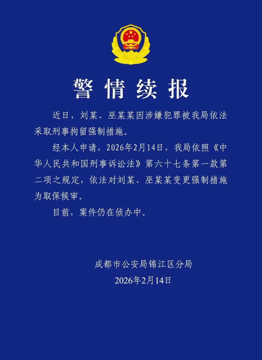 Liu Hu and Wu Yingjiao had been launched on bail on February 16, simply two weeks earlier than the prize outcomes appeared. “I consider everybody will welcome this ‘follow-up police report,’” wrote rights protection lawyer Pu Zhiqiang (浦志强) on social media. “Greatest needs to you each: get some correct relaxation and have an excellent New 12 months.”
