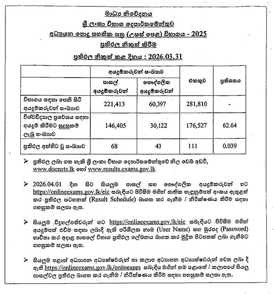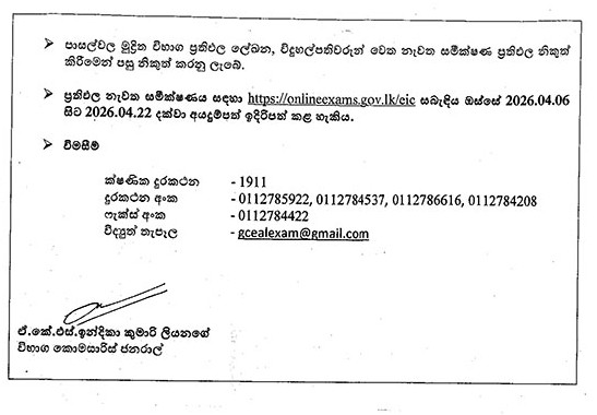 In response to the Division, candidates can test their outcomes by visiting www.doenets.lk or www.outcomes.exams.gov.lk.